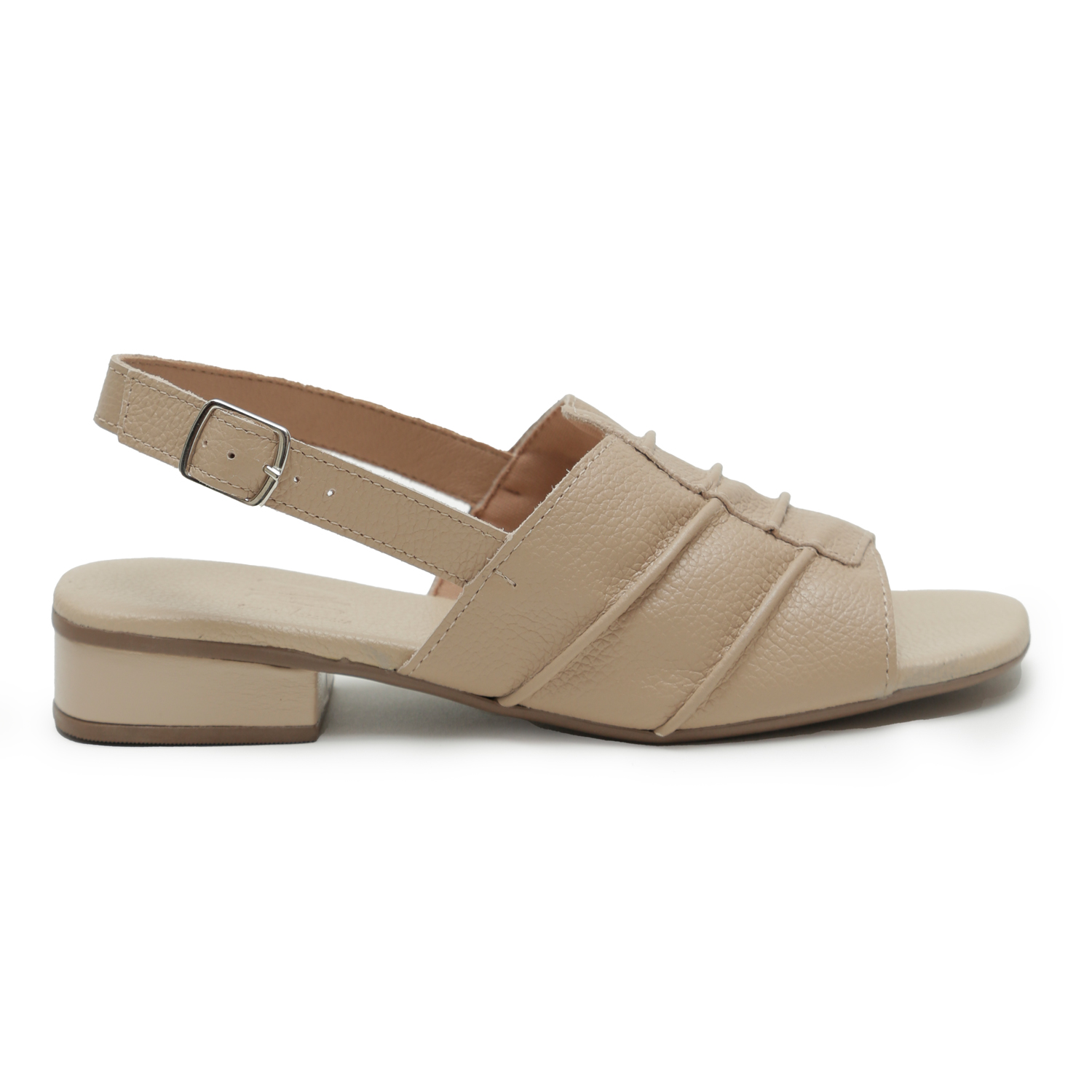 Sandália de salto baixo, em couro legítimo super macio tipo floater, forrada com material têxtil, modelo com dobras e costuras enviesadas. Palmilha conforto, forrada em couro e almofadada, solado em borracha antiderrapante. Ajuste e fechamento com fivela na tira traseira. Altura do salto: 3 cm