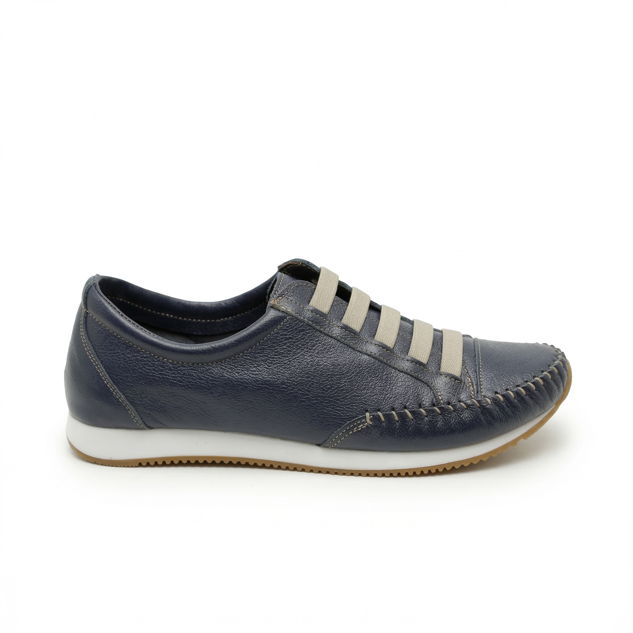Os elásticos no peito do pé substituem o cadarço tradicional, oferecendo calce fácil e prático, ideal para a correria do dia a dia, sem abrir mão do ajuste.